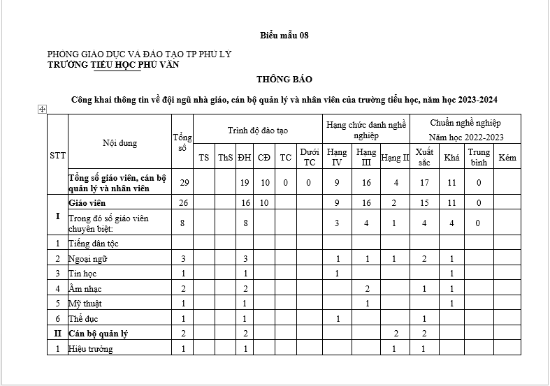 Công khai thông tin về đội ngũ nhà giáo, cán bộ quản lý và nhân viên của trường tiểu học, năm học 2023-2024
