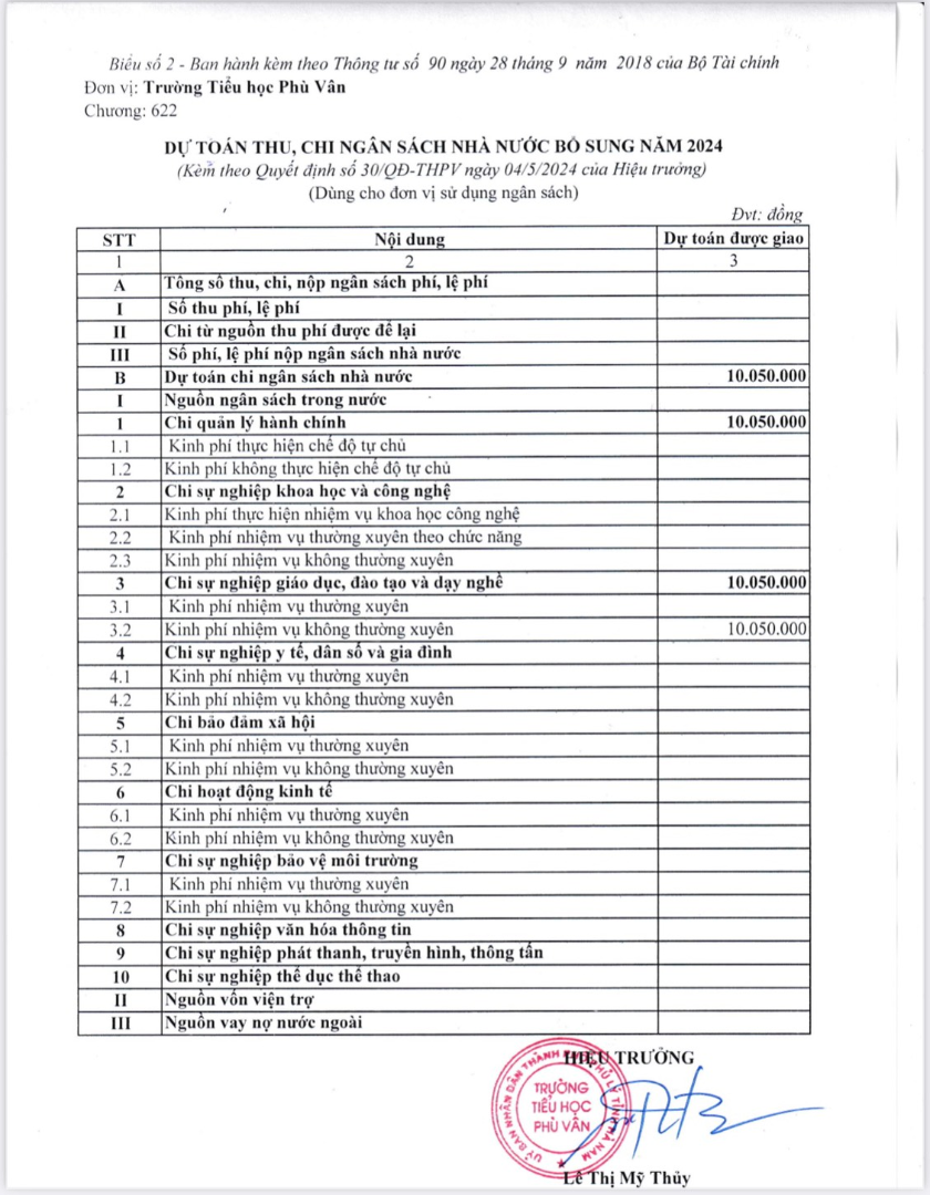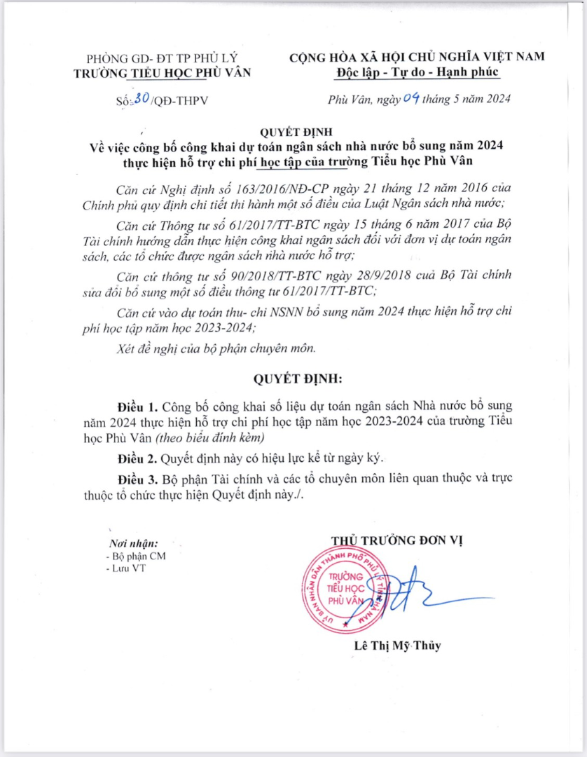 Trường Tiểu học Phù Vân công bố Quyết định công khai dự toán ngân sách nhà nước bổ sung năm 2024 thực hiện hỗ trợ chi phí học tập của trường.