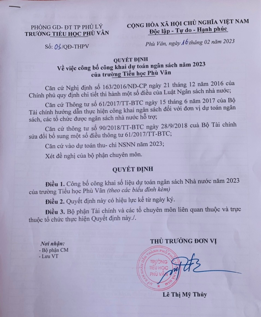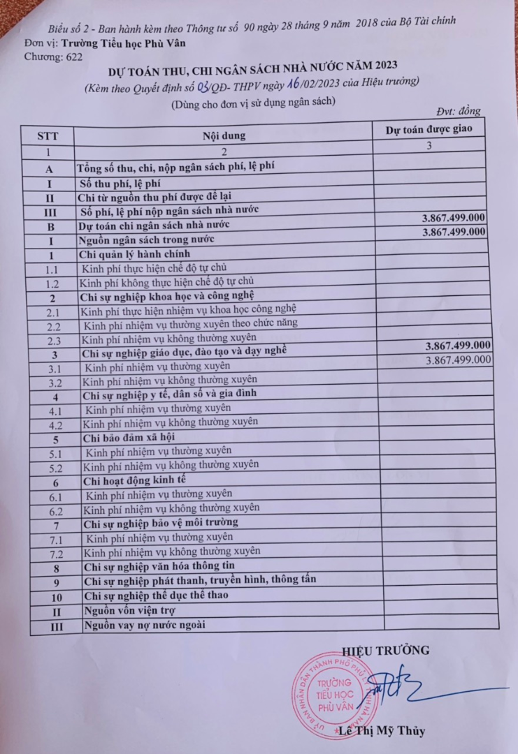 Quyết định về việc công bố công khai dự toán ngân sách năm 2023 của trường Tiểu học Phù Vân
