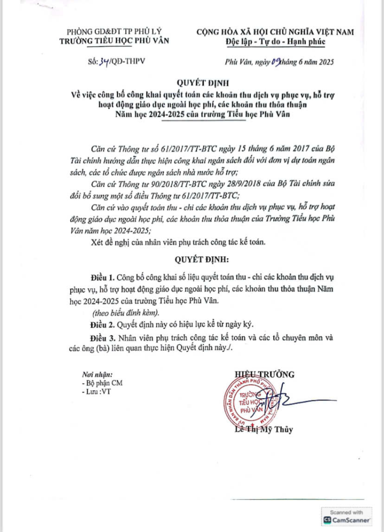 Quyết định về việc công bố công khai quyết toán các khoản năm 2024-2025 của trường TH Phù Vân