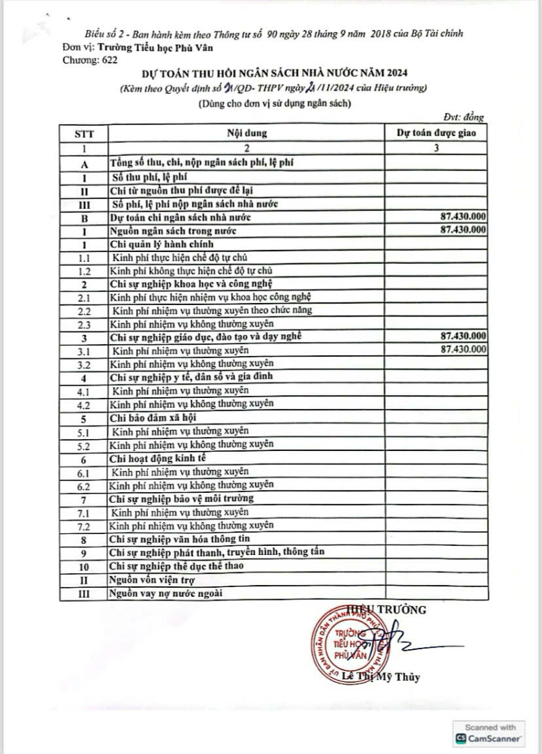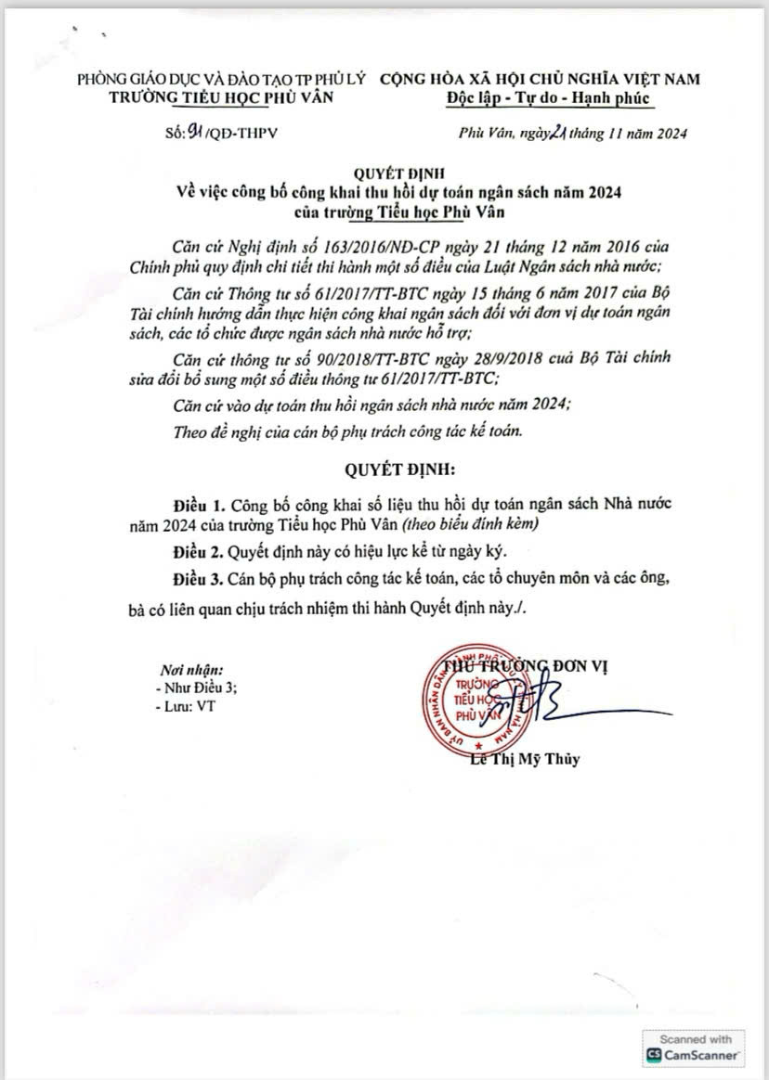 Quyết định về việc công bố công khai thu hồi dự toán ngân sách năm 2024 của trường Tiểu học Phù Vân