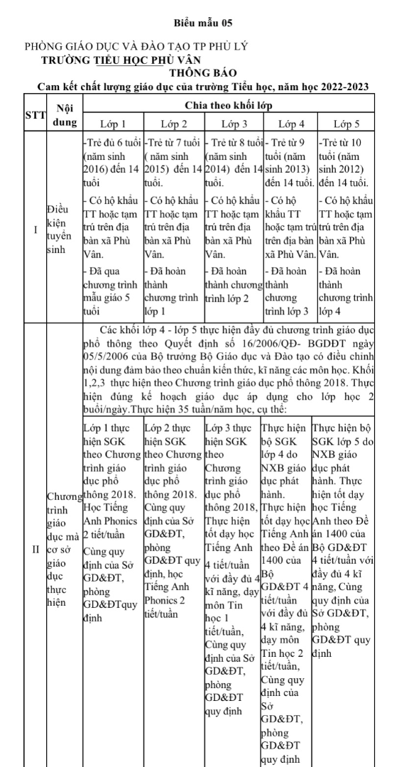 Trường Tiểu học Phù Vân Thông báo tuyển sinh năm học 2022-2023