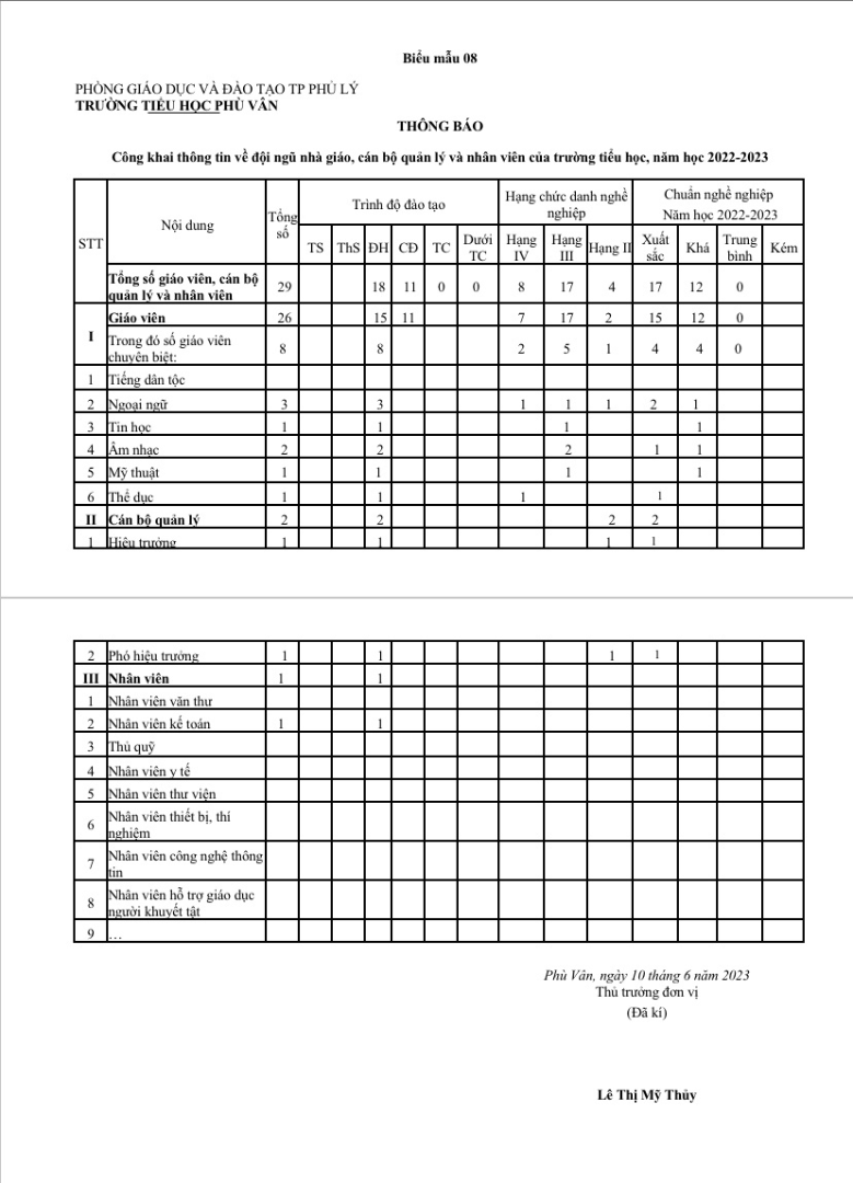 Thông báo Công khai thông tin về đội ngũ nhà giáo, cán bộ quản lý và nhân viên của trường tiểu học năm học 2022-2023